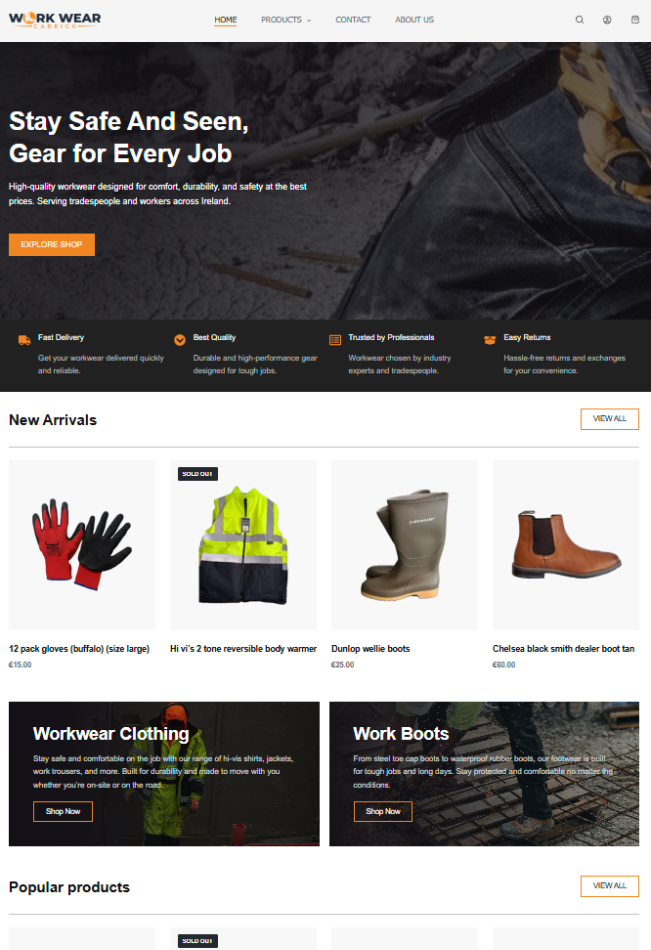 Work Wear Carrick – An online shop developed for a local workwear supplier, allowing customers to browse and order products with ease. Designed for clear product presentation, secure shopping experience, and local business feel.